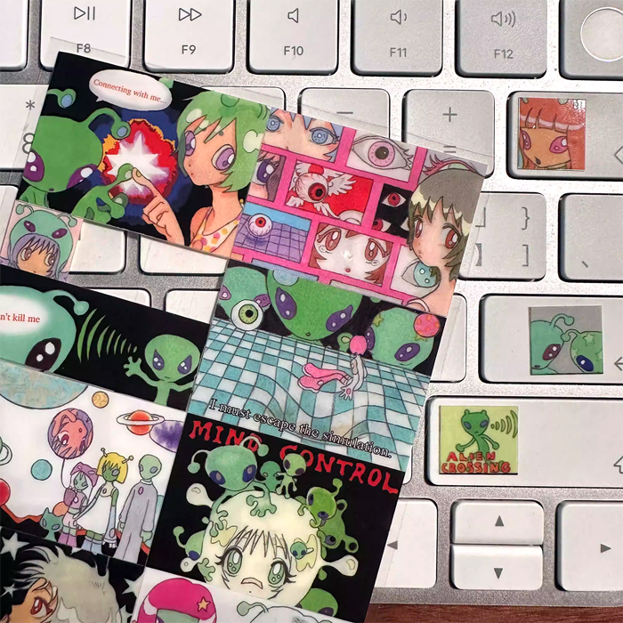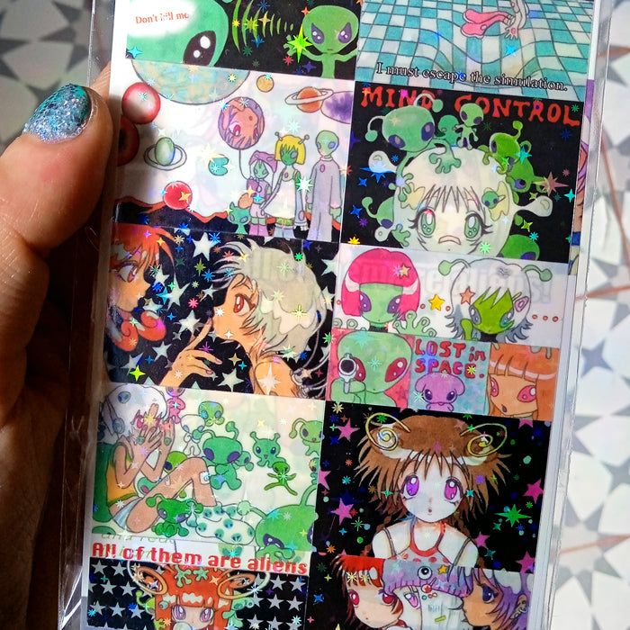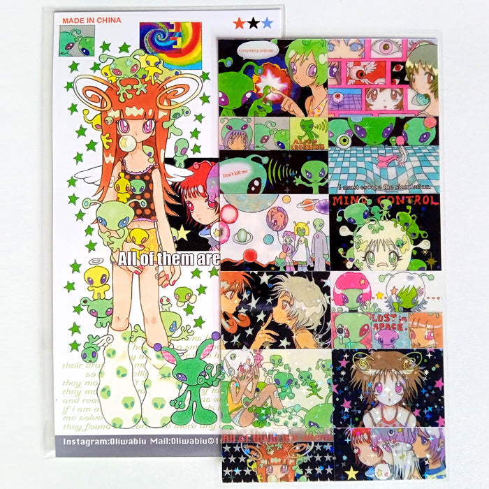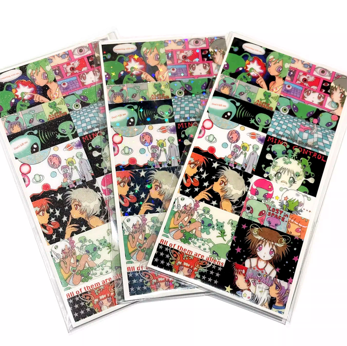 1 sticker sheet. Includes a mini print that can be used as a postcard or for decoration! The stickers come in 3 different finishes: clear, frosted and holographic stars... We'll send you a surprise one ☆