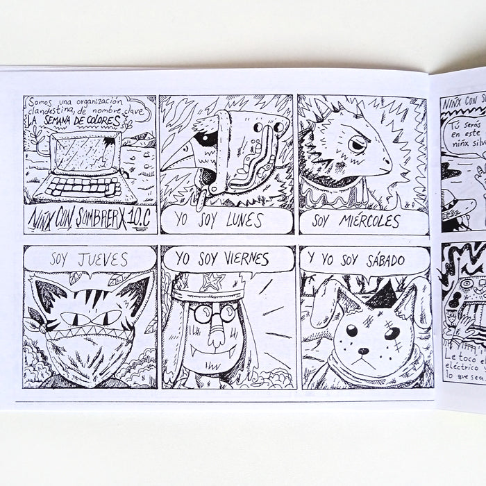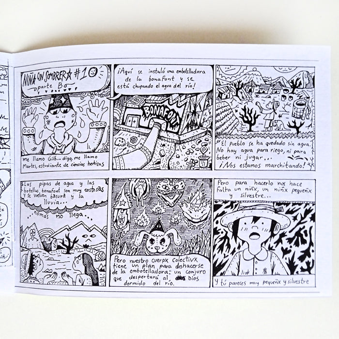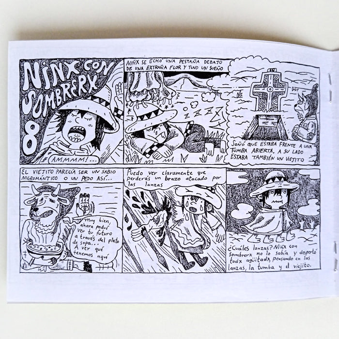 A zine collecting comic strips by Ulalume Flores featuring a kid with a hat who gets involved in surreal adventures involving dreams, magic and traditional Mexican lore