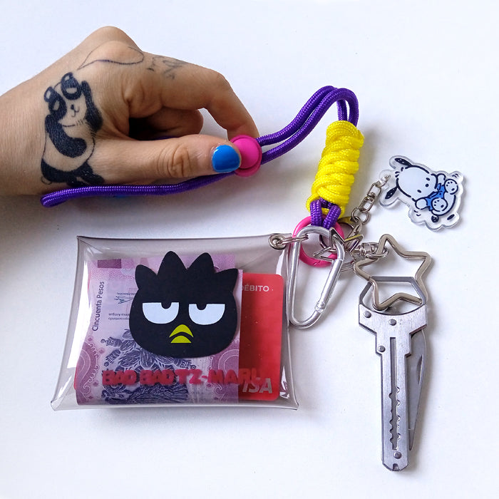 Transparent plastic coin purse with metallic clasp. Originally made in 2020 as exclusive merch for Sanrio's Puroland theme park in Tokyo