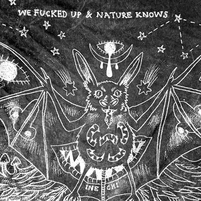 Grey acid wash tshirt with a design by Inechi originally made in 2015, now hand screen printed by us in white plastisol ink!