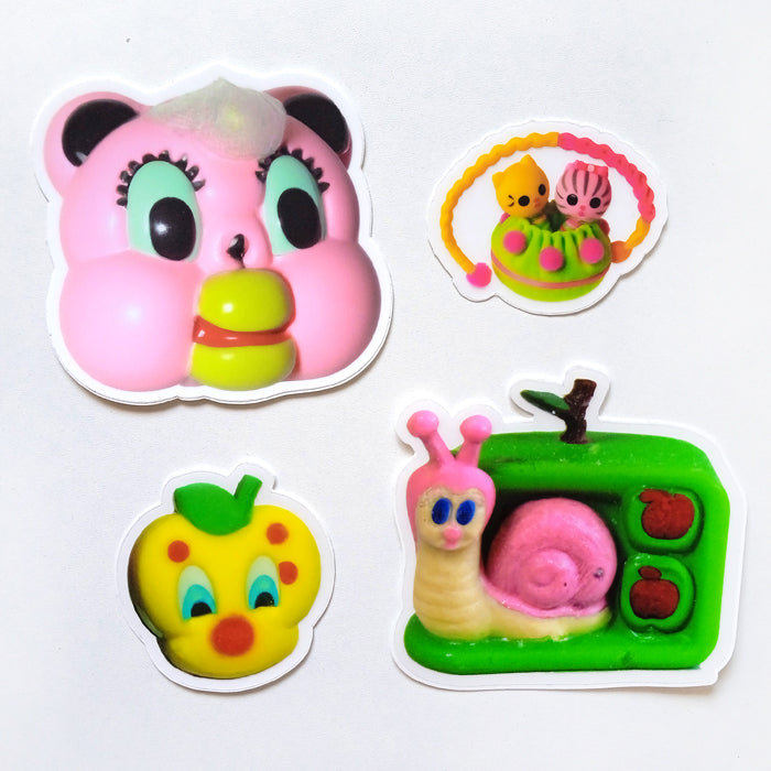 Set of 4 matte stickers. These funny characters were made by Ginette Lapalme through DALL·E 2, inspired by bootleg figurines and taking advantage of how AI tools like this tend to generate images that always look a bit off anyway...