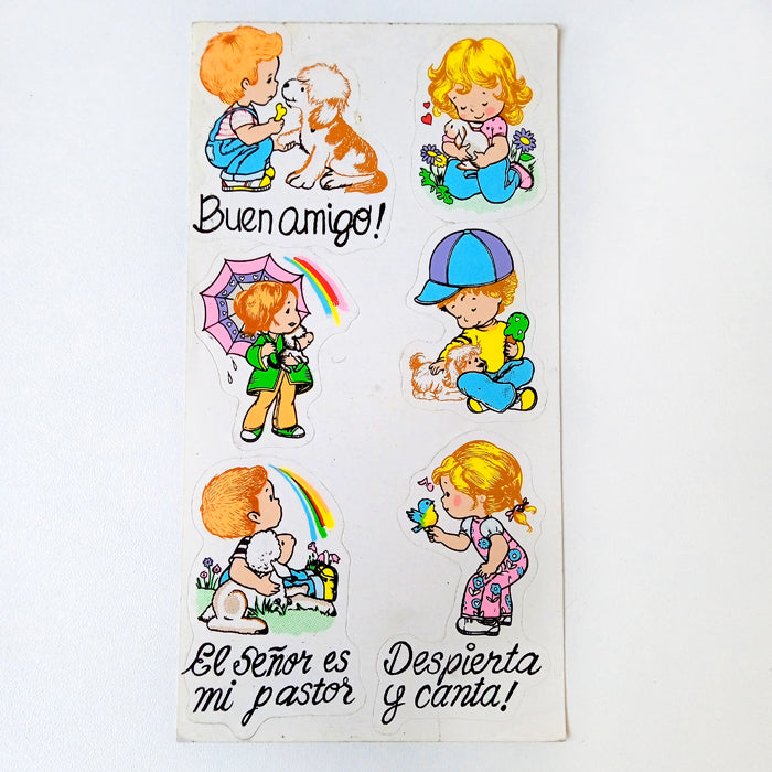 1 vintage sticker sheet. Christian designs screen printed here in Mexico City in the 90s. The adhesive they used has a very nice smell that is unlike any stickers made today