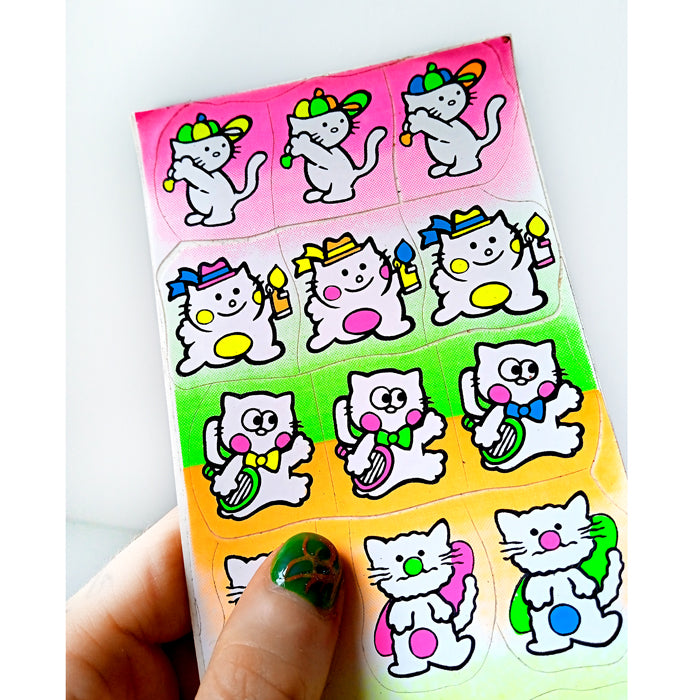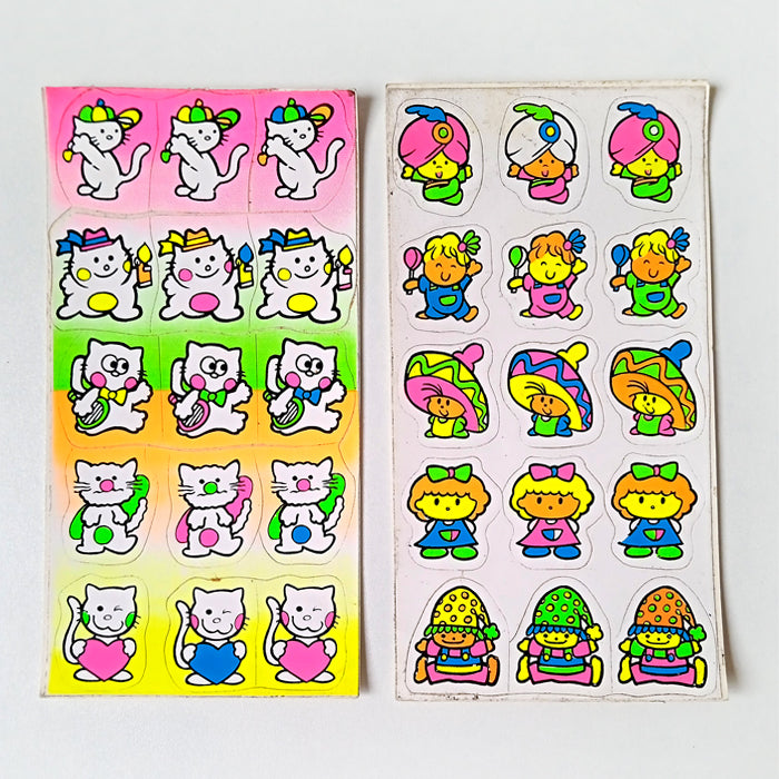 Set of 2 vintage sticker sheets. Screen printed in the 90s with extremely bright neon inks that are impossible to photograph! Also the adhesive they used has a very nice smell that is unlike any stickers made today