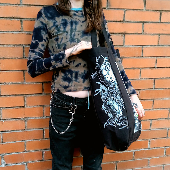 XL tote bag design by Gabriela Fraga screen printed in black plastisol ink. Ideal for laundry, a month's worth of groceries haul, or any other big amounts of things you need to carry around! Has an interior pocket so your phone and keys don't get lost in the deep bottom ; )