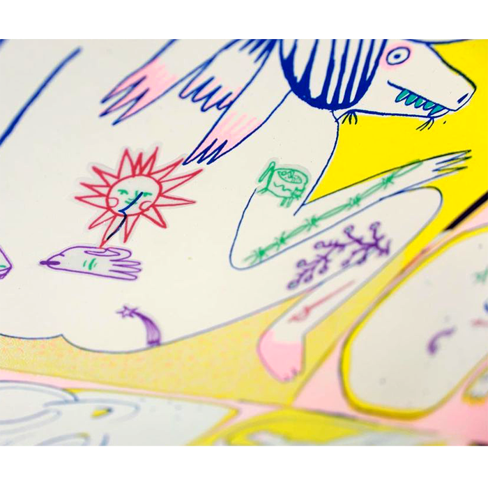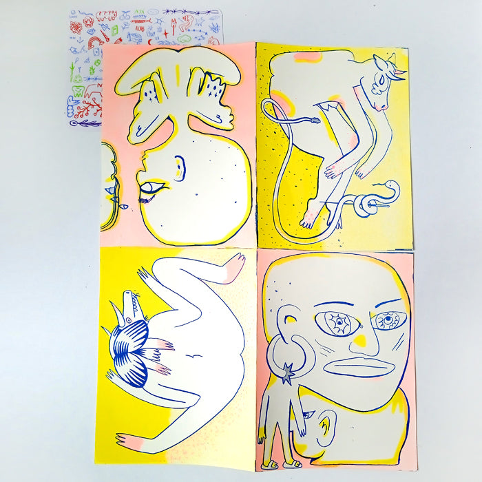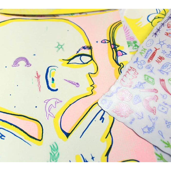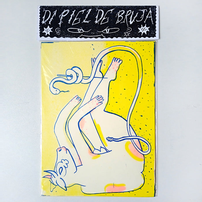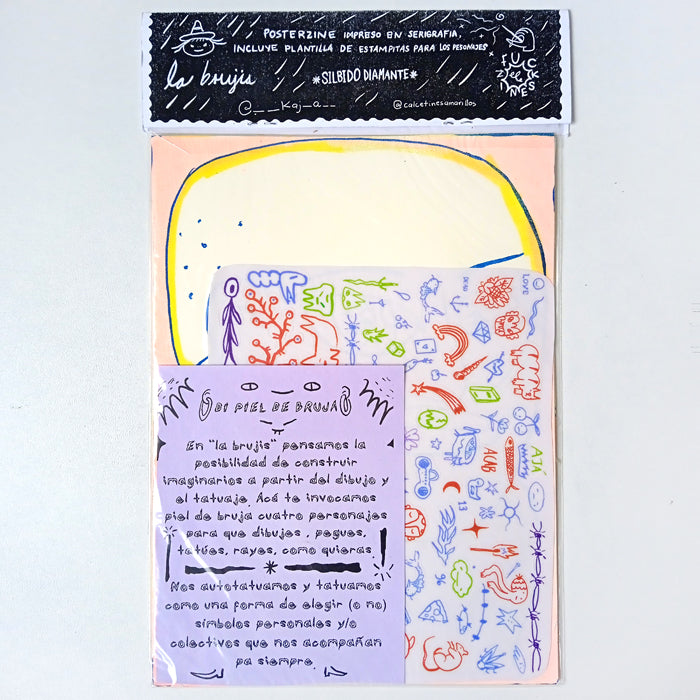 This interactive, foldout poster zine is an exploration on tattoos and how through them we can enjoy our own bodies. The title, meaning "Say witch skin" refers to the power of magic and manifestation, and tattoos as a form of that. Includes a sticker sheet to use as tattoos for the characters on each page! You are also encouraged to draw on them, or intervene in any way you want. Beautifully hand screen printed by Paulina Conjuntivitis of Fuck Zines.