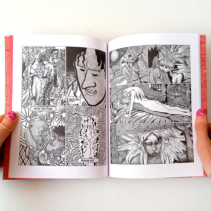 "A group of friends, armoured by youth but numbed by the overload of the modern world, embark on a series of journeys, both outside and inside. From a depressed but hospitable dragon, to cities bustling with unearthly life, through ecological collapse and rebirth, through the eruptions of new religions and old devils, this restless, unsettling comic brims with startling and unforgettable imagery. The electric sizzle of today rises with the heat haze of the past. The landscape rises up to swallow ruins, while the city looks on. The sun climbs higher in an unforgiving sky.