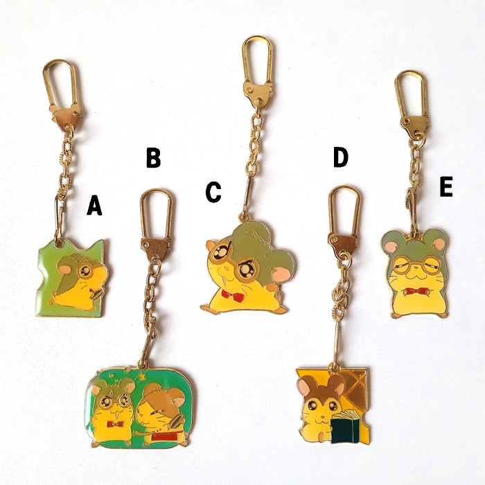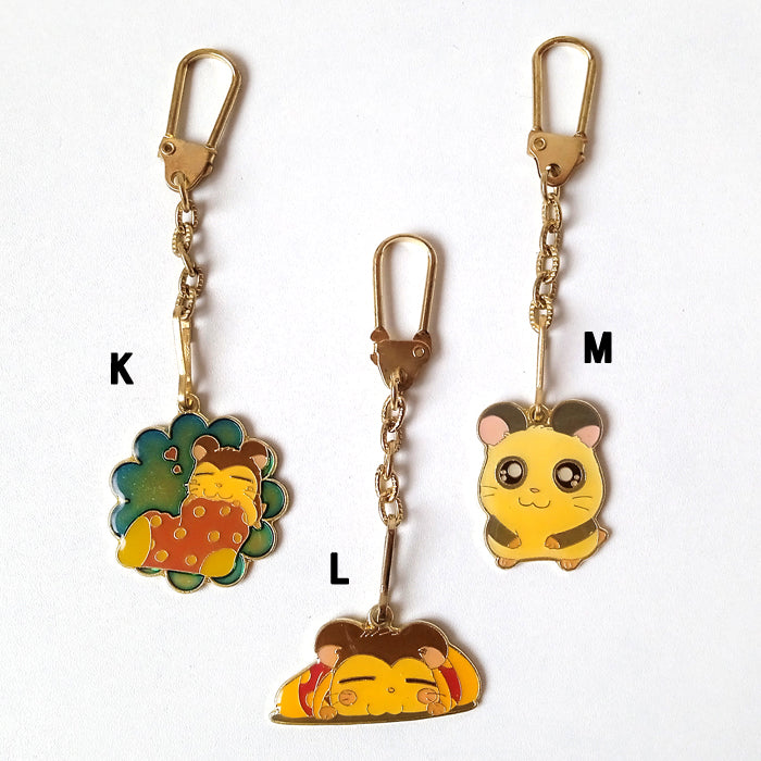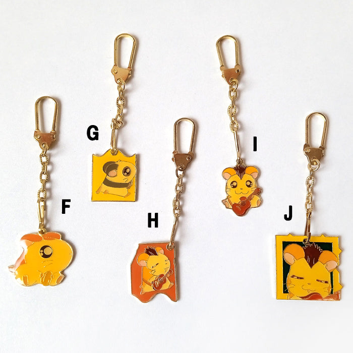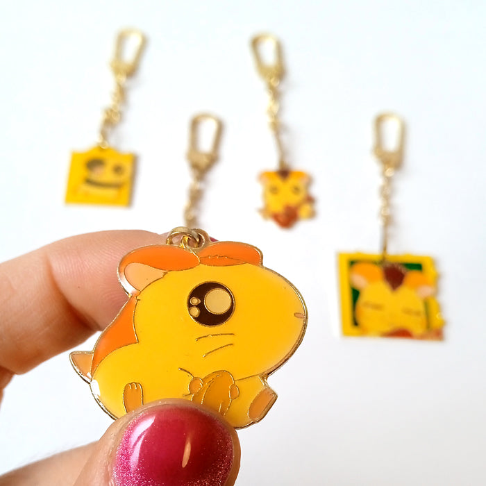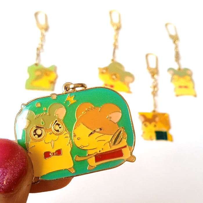 Vintage Hamtaro character keychains made with gold hardware and epoxy. These are official merch from the late 1990s so they show some yellow tint as is always the case after a few years with items with epoxy... Super limited stock, imported from Japan!