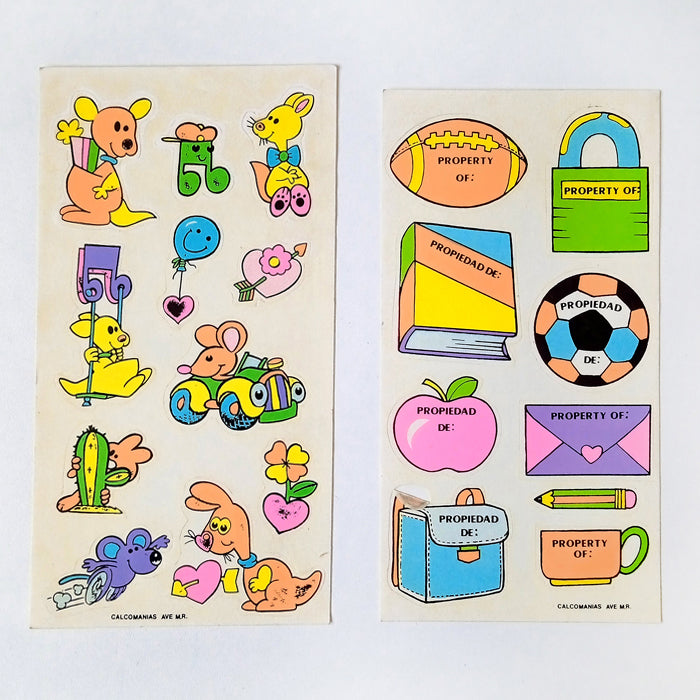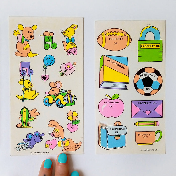Set of 2 sticker sheets made here in Mexico City in the 90s. The print is extremely bright neon and impossible to photograph! Sticker sheet on the right are labels for school notebooks.