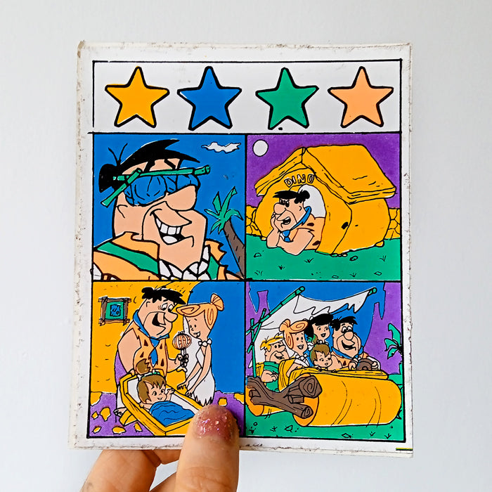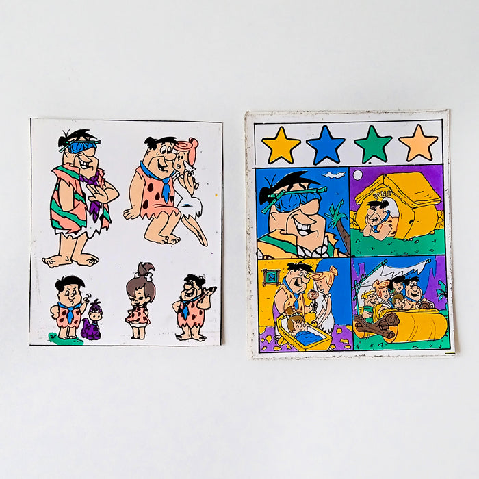 Set of 2 vintage stickers. Screen printed here in the 90s with extremely bright neon inks that are impossible to photograph! These are supposed to be cut by yourself and feature surreal designs of Los Picapiedra (The Flintstones) straight out of bootleg paradise