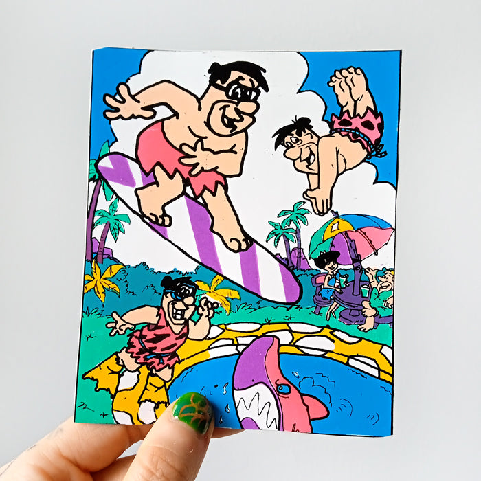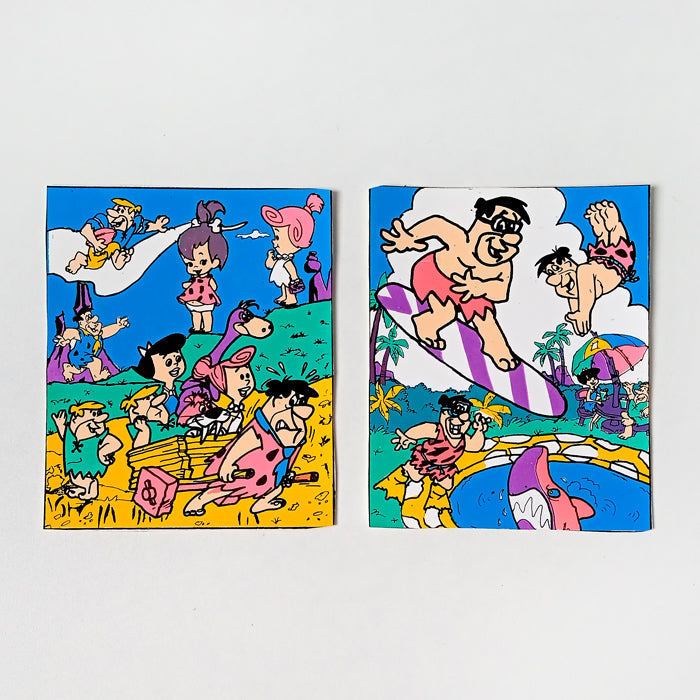 Set of 2 vintage stickers. Screen printed here in the 90s with extremely bright neon inks that are impossible to photograph! Featuring surreal designs of Los Picapiedra (The Flintstones) straight out of bootleg paradise