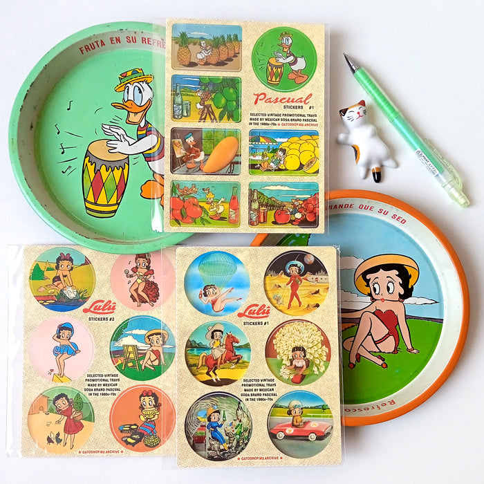 We're so in love with these vintage trays from Mexico City's iconic soda brand Pascual and their mascot Lulú (Betty Boop's latina cousin) that we've decided to turn them into stickers! A bootleg of the bootleg, if you will... Includes surprise postcard!