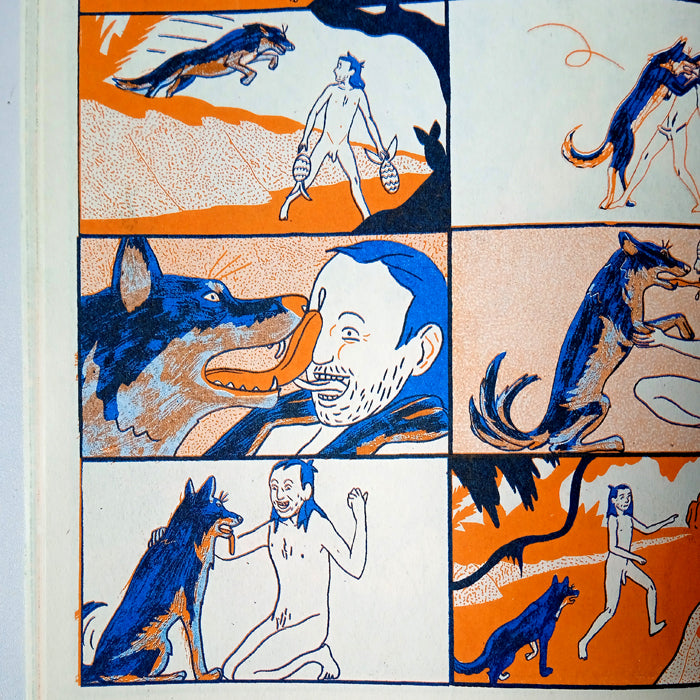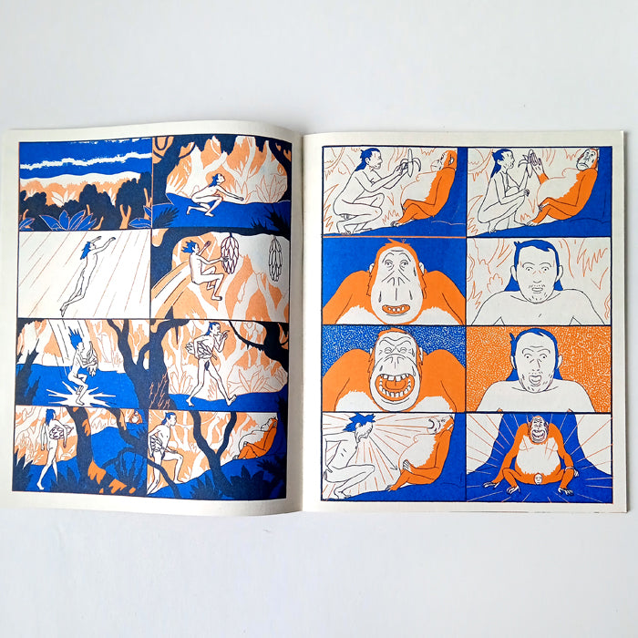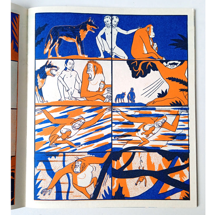 "Mowgli's Mirror" is a wordless and cinematic risograph comic by one my favourite cartoonists from Belgium. In this story, the young human boy Mowgli lives alone in the jungle. When he befriends an orangutan, Mowgli thinks he has found his lifemate. But Mowgli still wonders if there any other creatures that look like him. Mowgli sets out on a journey through the jungle, encountering all types of creatures and having numerous adventures.