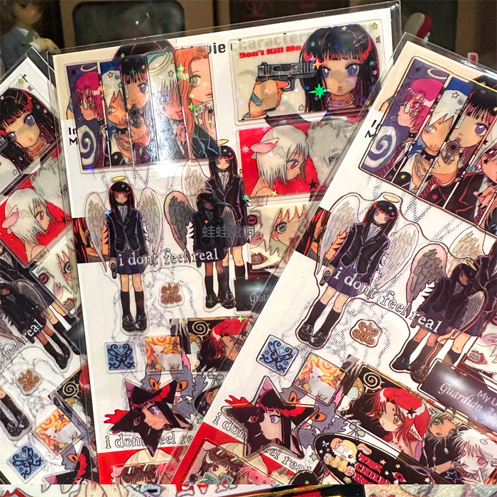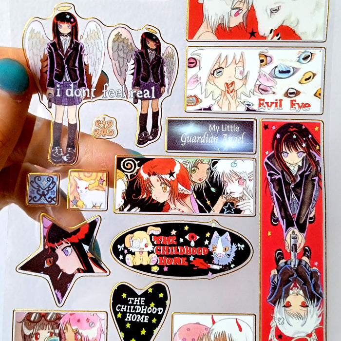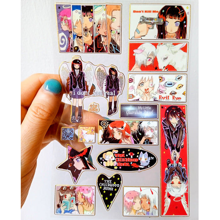 1 sticker sheet. Includes a mini print that can be used as a postcard or for decoration! The stickers come in 3 different finishes: golden edges, frosted and holographic stars... We'll send you a surprise one ☆