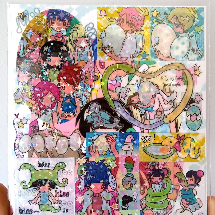 1 sticker sheet. Includes a mini print that can be used as a postcard or for decoration! We have these available in 2 different finishes: matte white, holographic stars and frosted... We'll send you a surprise one!