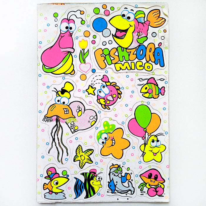 Vintage vinyl sticker sheet. Screen printed in the 80s with extremely bright neon inks that are impossible to photograph! Also the adhesive they used has a very nice smell that is unlike any stickers made today. Only 1 available!