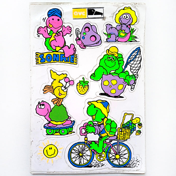 Vintage vinyl sticker sheet. Screen printed in the 80s with extremely bright neon inks that are impossible to photograph! Also the adhesive they used has a very nice smell that is unlike any stickers made today. Only 1 available!