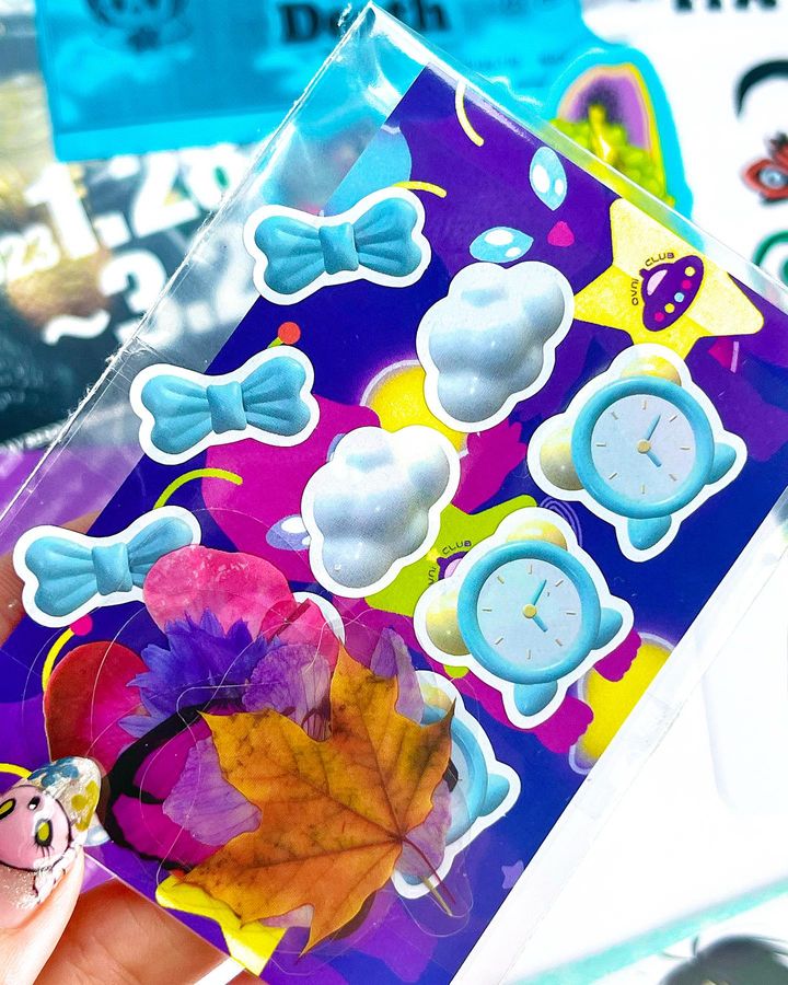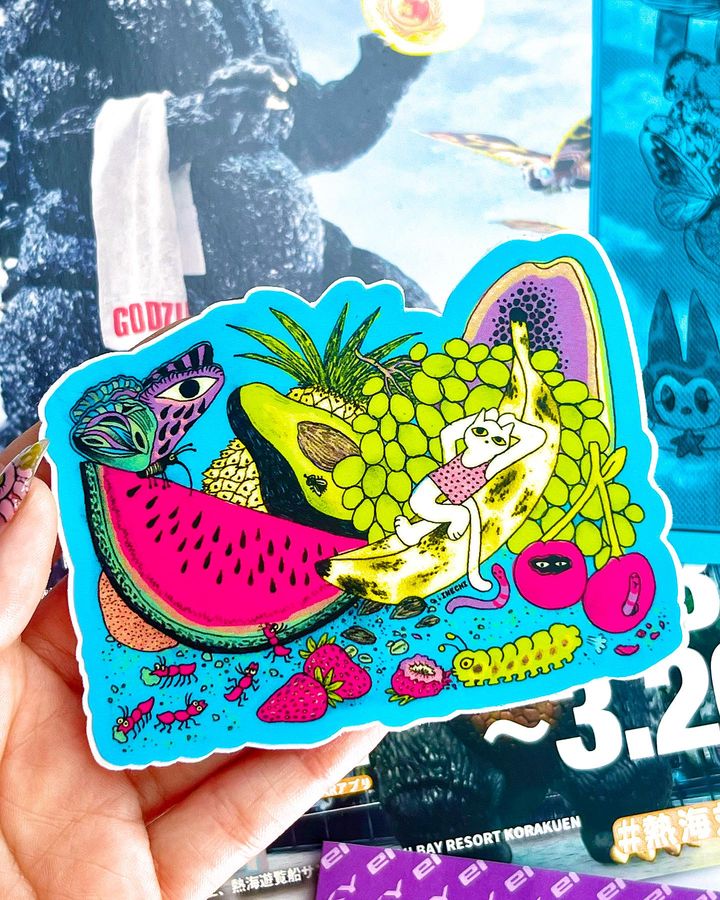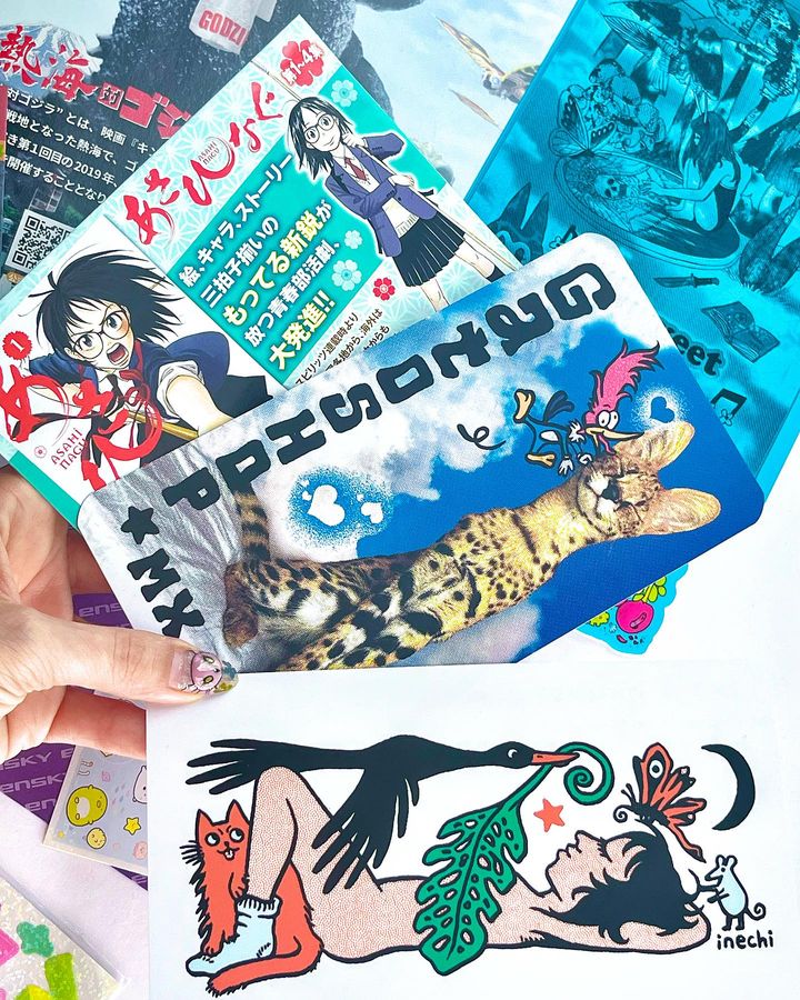 These lucky bags includes various printed goodies from Japan, as well as a blue mini print with a drawing by Marisol, and a fruits sticker plus a postcard by Inechi!