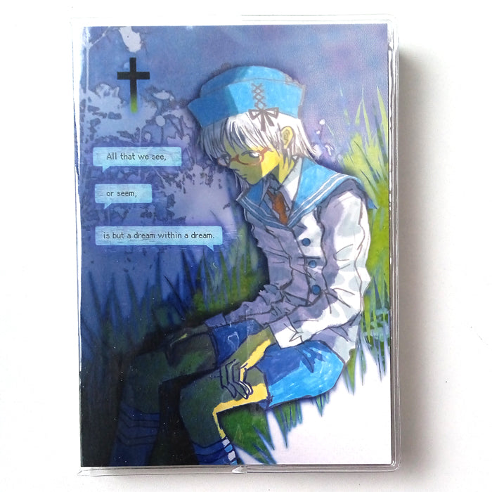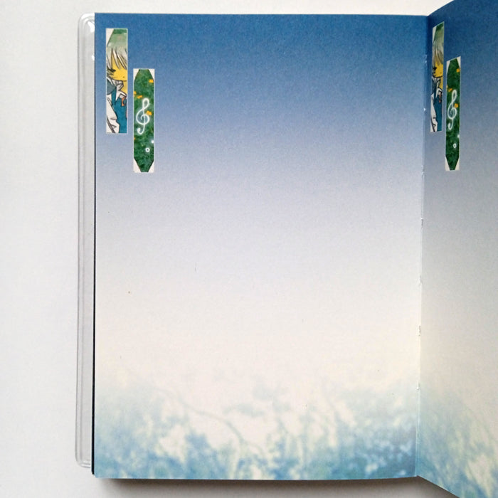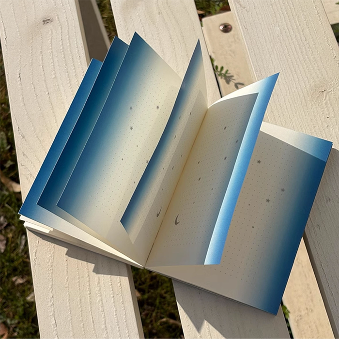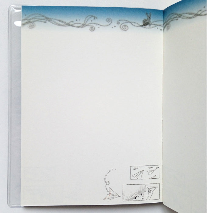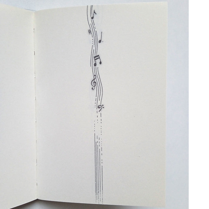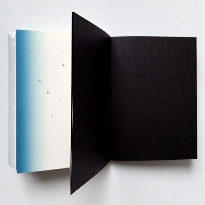 A6 size notebook with various designs on the interior pages, a plastic cover, stickers and very nice sewn binding that allows you easily open the notebook completely flat !