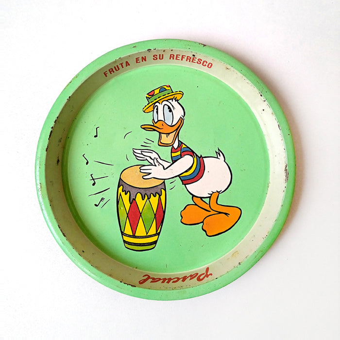 A vintage metal tray made in the 1960s-70s as merch for Pascual, a soda brand from Mexico City. Pascual was owned by the workers as a cooperative business and they did not give a fck to grab Donald and reinvent him into their mascot, Pascual! These trays are a staple of Mexican design, and are perfect both as decoration and to hold keys, jewelry and other trinkets