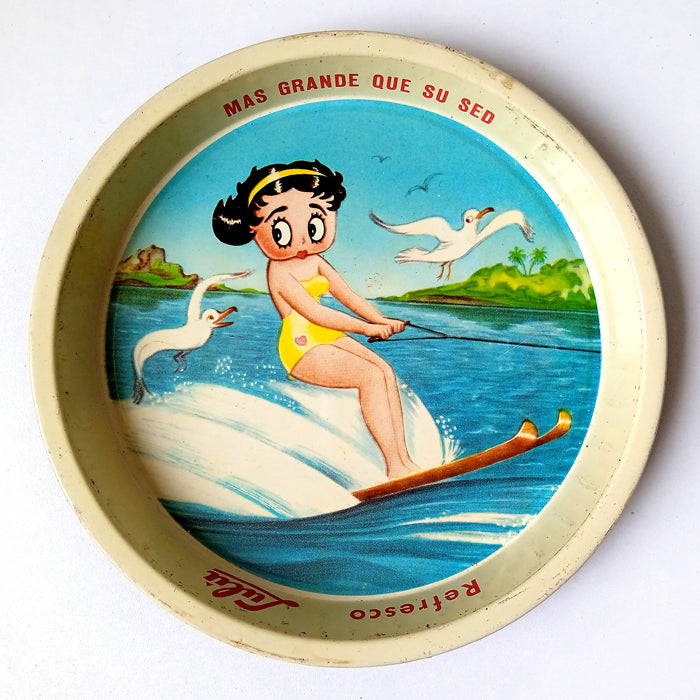 A vintage metal tray made in the 1960s-70s as merch for Pascual, a soda brand from Mexico City. Pascual was owned by the workers as a cooperative business and they did not give a fck to grab Betty Boop and reinvent her into their mascot, Lulú! These trays are a staple of Mexican design, and are perfect both as decoration and to hold keys, jewelry and other trinkets