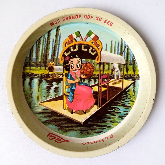 A vintage metal tray made in the 1960s-70s as merch for Pascual, a soda brand from Mexico City. Pascual was owned by the workers as a cooperative business and they did not give a fck to grab Betty Boop and reinvent her into their mascot, Lulú! These trays are a staple of Mexican design, and are perfect both as decoration and to hold keys, jewelry and other trinkets