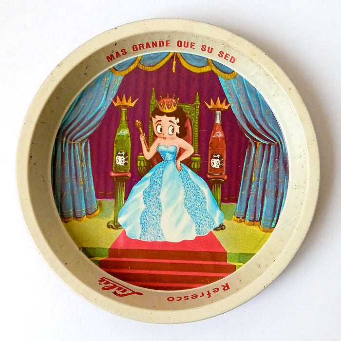 A vintage metal tray made in the 1960s-70s as merch for Pascual, a soda brand from Mexico City. Pascual was owned by the workers as a cooperative business and they did not give a fck to grab Betty Boop and reinvent her into their mascot, Lulú! These trays are a staple of Mexican design, and are perfect both as decoration and to hold keys, jewelry and other trinkets