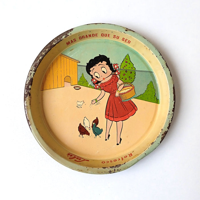 A vintage metal tray made in the 1960s-70s as merch for Pascual, a soda brand from Mexico City. Pascual was owned by the workers as a cooperative business and they did not give a fck to grab Betty Boop and reinvent her into their mascot, Lulú! These trays are a staple of Mexican design, and are perfect both as decoration and to hold keys, jewelry and other trinkets