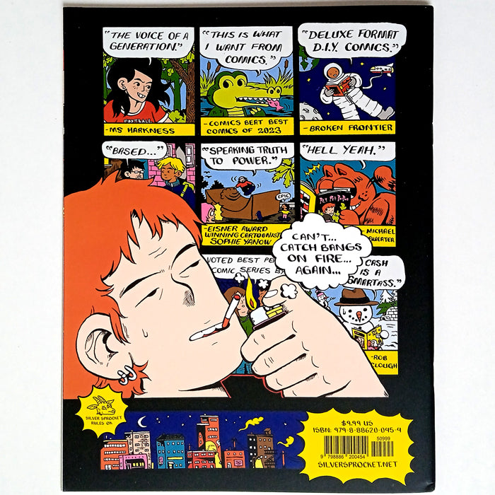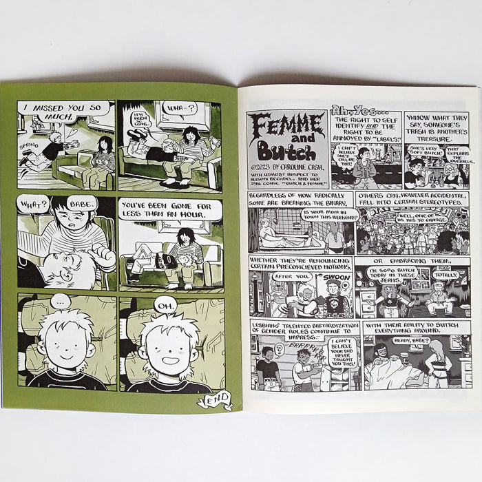 "In this issue: Caroline discovers a fresh start is surprisingly hard to make in “Ah, Philly.” Romance blossoms in “First Date,” a classic Alison Bechdel comic gets an update in “Femme and Butch,” and a night out turns complicated in “Stoned Again.” Caroline Cash's gay, modern take on the ‘60s underground comic continues to make readers say “hell yeah.”" –Silver Sprocket