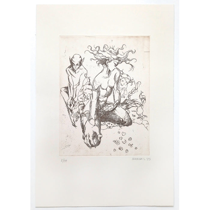 Untitled etching edition of 14 prints by Chilean artist Ibi, hand made at Epigono E.G.L in Mexico City. The edition was printed in two different paper tones. The magenta variant is a 1/1 colour test.