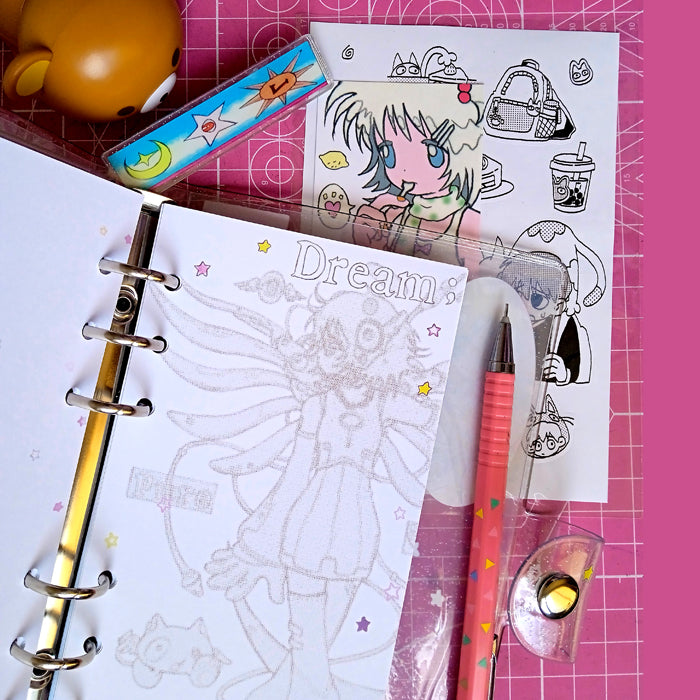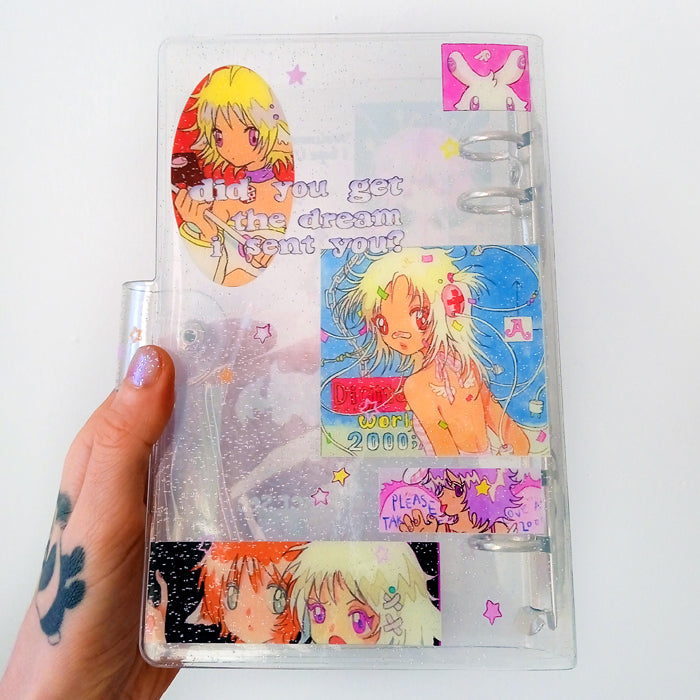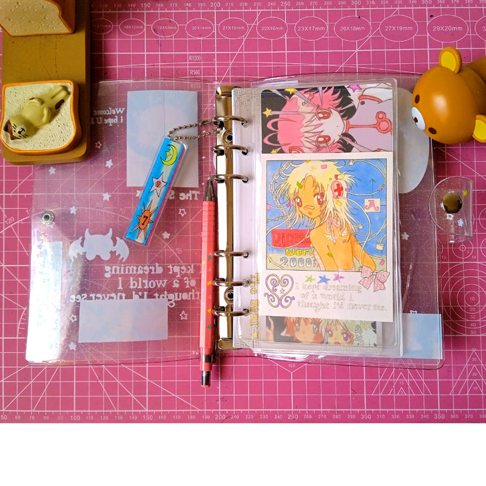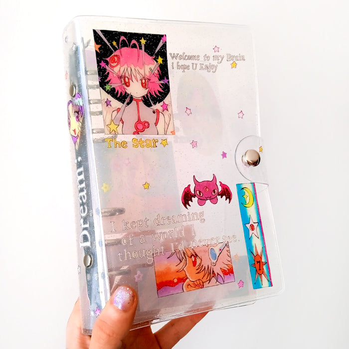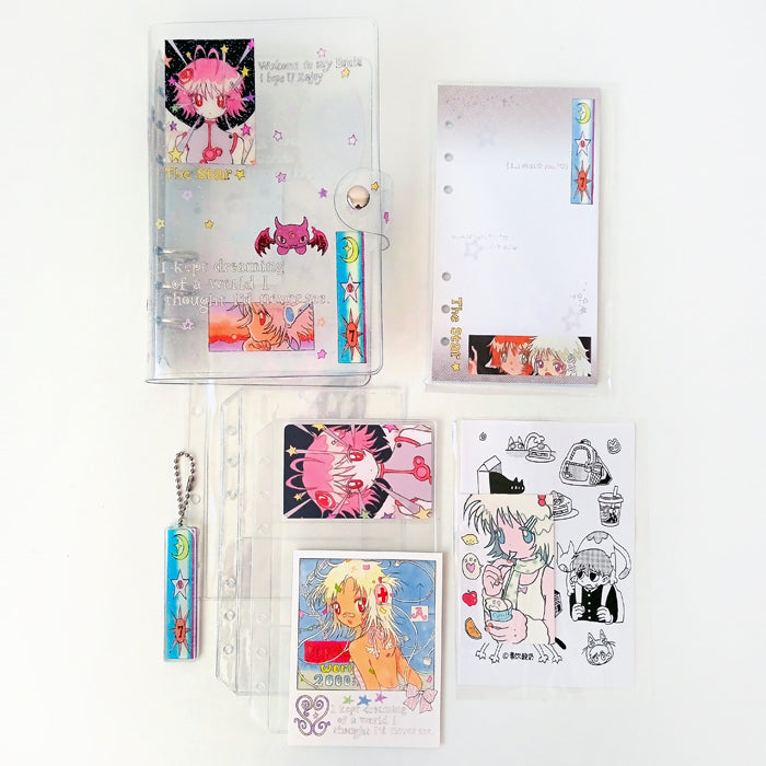 A6 size binder made with glittery PVC. Includes everything you see on the first picture: Inserts for notes (20 pages with 4 designs), inserts for stickers or cards, a keychain, mini prints & a sticker sheet!