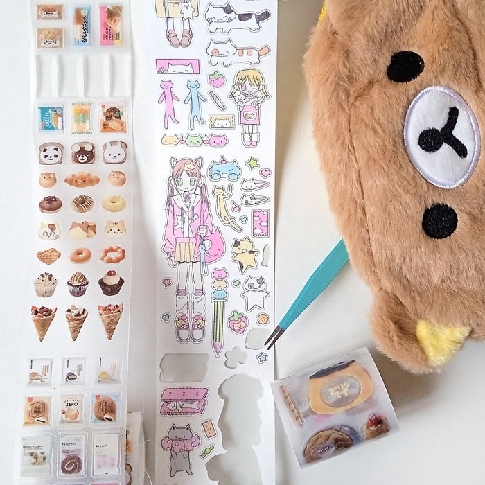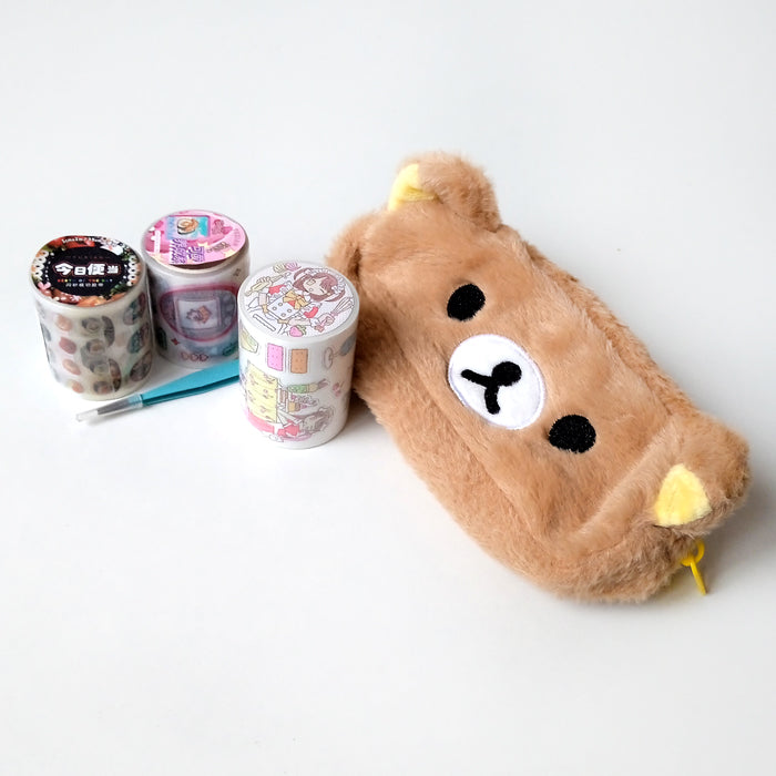 Set of 3 sticker rolls inside a fluffy bear bag that can be used for pens or make up! These are not washi tapes, they're rolls with stickers: each design is individually cut out, and also the material they're made of is PVC, which is plastic and a bit more durable than washi. We're also including tweezers to help you use these better as some of the stickers are veeery tinyyy!