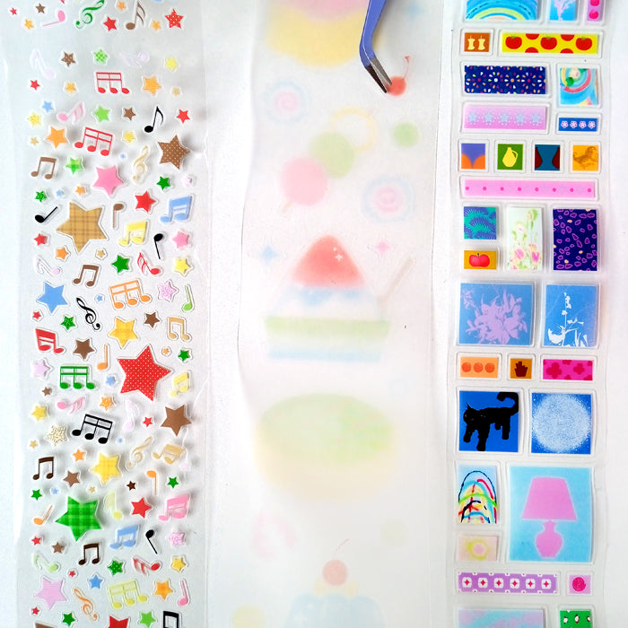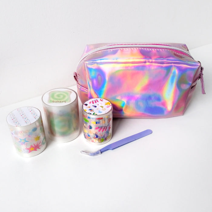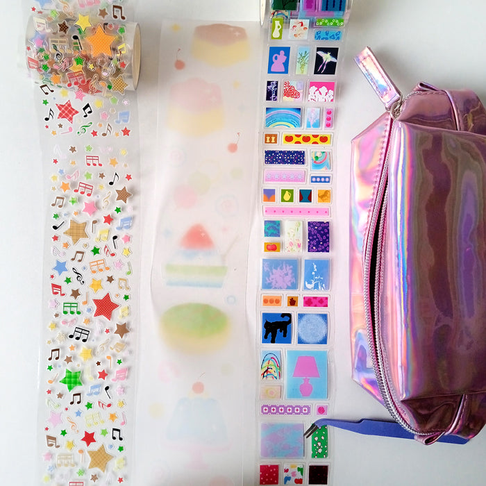 Set of 3 sticker rolls inside a holographic bag that can be used for pens or make up! These are not washi tapes, they're rolls with stickers: each design is individually cut out, and also the material they're made of is PVC, which is plastic and a bit more durable than washi. We're also including tweezers to help you use these better as some of the stickers are veeery tinyyy!