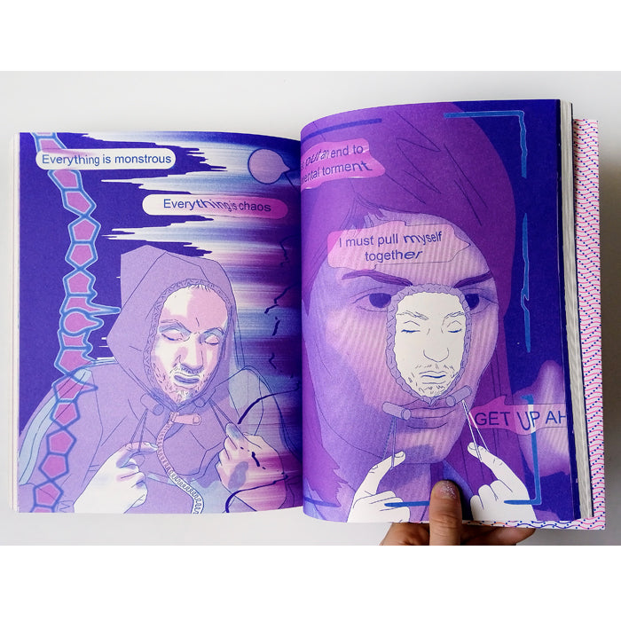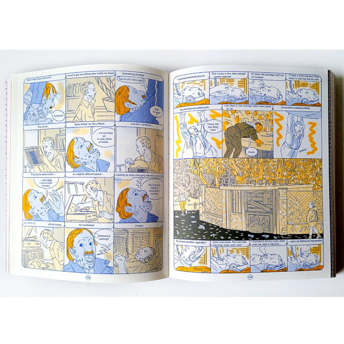 "Sunday follows, over the course of one day, the stream of consciousness of a fictionalized version of the author’s cousin, Thibault. On the day of his girlfriend’s return from an extended trip, Thibault wakes up, does nothing, gets James Brown stuck in his head, drinks and smokes, grows paranoid about his relationship, struggles to compose text messages, and watches The Da Vinci Code, all the while avoiding anyone and everyone, descending deeper into his own thoughts and fears. Meanwhile, a former crush and another cousin of Thibault’s plan a surprise birthday for him, sending the external and internal on a collision course. Schrauwen’s brilliant comic timing and formal mastery transcends the quotidian nature of the plot. Through use of color, flashback and the dissonance between text and image, the ways in which Schrauwen layers a depiction of human consciousness as lines on paper are infused heavily with slapstick and white-knuckle tension and make for an exhilarating read and breathtaking use of the comics medium." –Fantagraphics