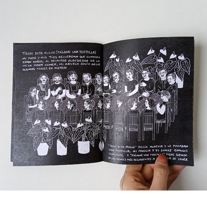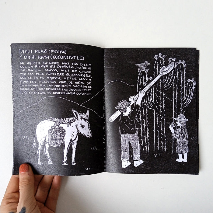 Illustrated zine about life in Huajuapan de León, a mountain town in Oaxaca and home to the Ñuu Savi (Mixteco) indigenous community. In this zine, Niño Cucaracha shares family stories told to him by his grandmother, and also explains some Tu'un Savi (Mixteco) phrases and words that are part of every day life in the community. A very personal glimpse into another culture and form of living, accompanied with beautiful drawings.