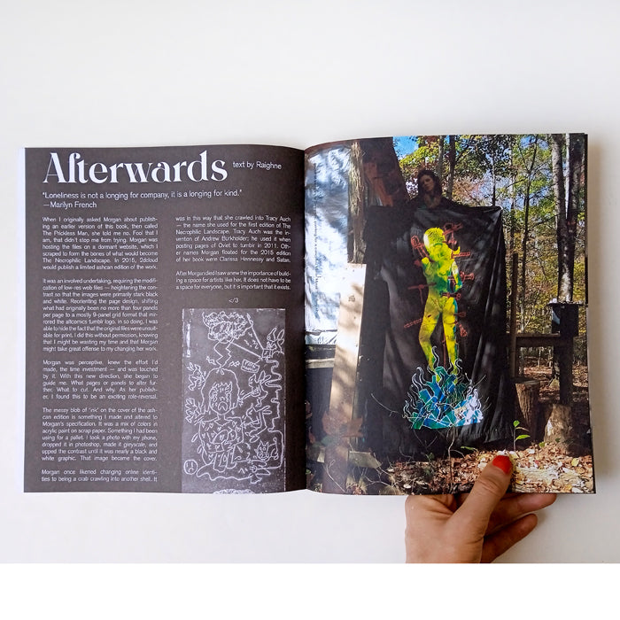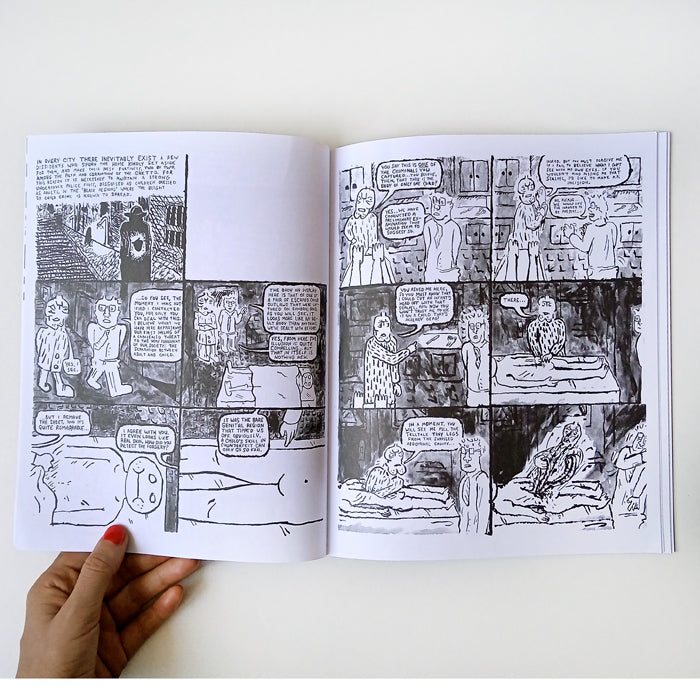 Morgan Vogel's The Necrophilic Landscape the world is split between adult men and male children— we’re told they’re identified and separated at birth. Men live in the city and children live in quasi-feudal, agrarian zones on its outskirts. But children may pass themselves off as men by merely standing on top of one another while wearing a trenchcoat. And the disguise is employed en masse, systematized, with untold numbers of paired children disguised as adults crossing into the city to become its criminals, terrorists, and illegal immigrants. An unfinished work which feels epic by sheer density of ideas per page and panel.