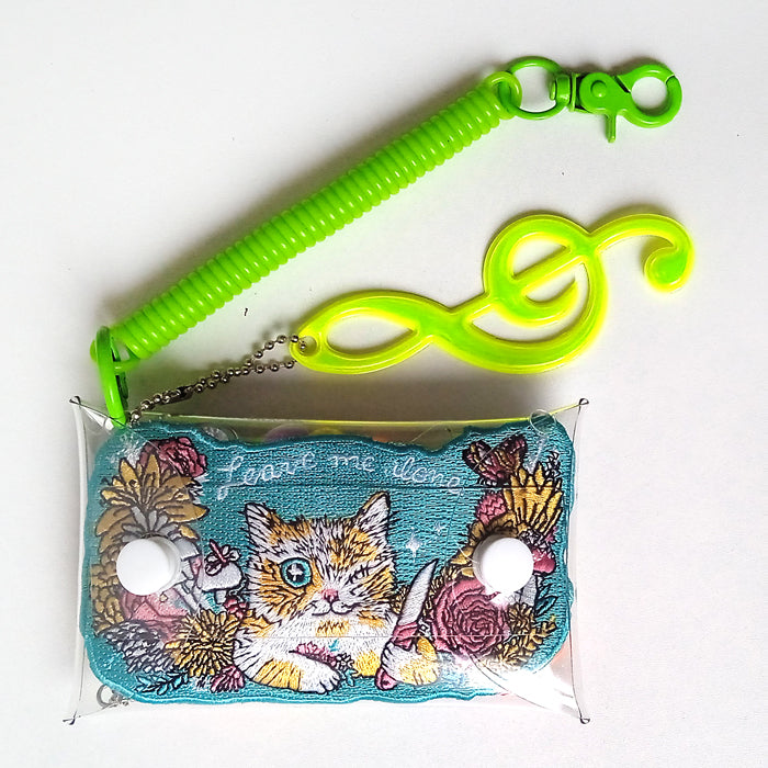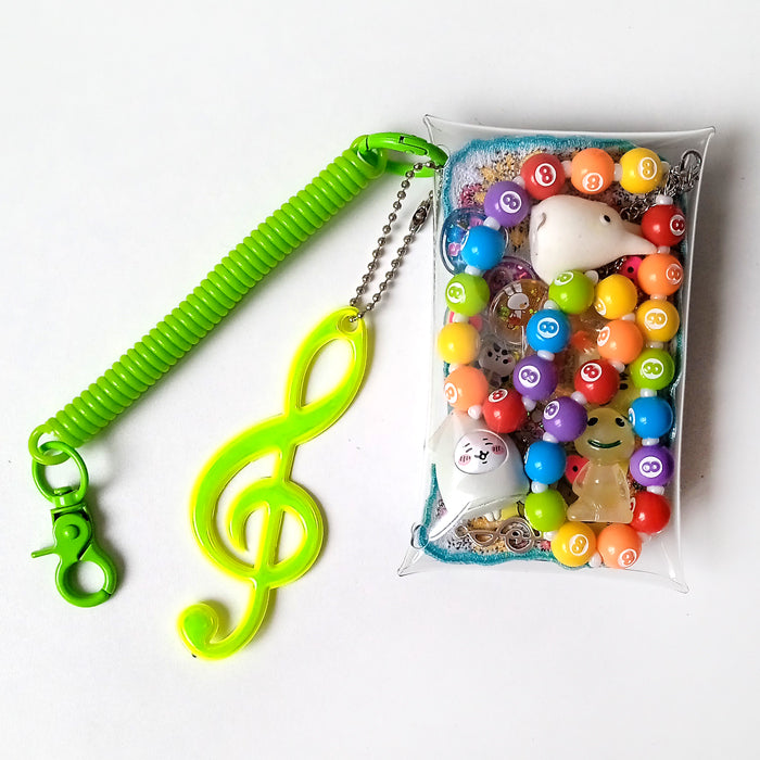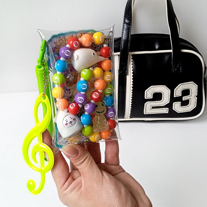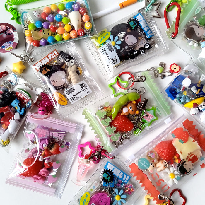 One of a kind trinket pouches curated by us specially for you ☆ We meticulously organized everything in this pouch so that it looks good and stays relatively in place, but nothing is actually fixed to anything so it's like a shaky keychain that you can play with. You can also take out what's inside and use it on its own! There's stickers, hairclips, keychains and more bits and bobs ♡